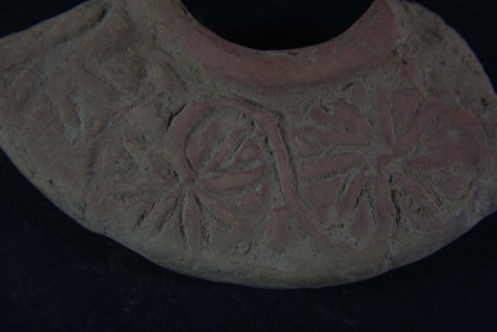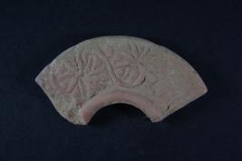 Fragment of a wheel with floral motifs embossed on its surafce.
