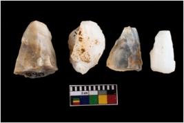 | Description / विवरण | There are n-4 of intact cores. Out of them 1 is made up Chalcedony and 3 are made up of Chert.There are multidirectional irregular dominant scar pattern on both dorsal and ventral face of the cores. |