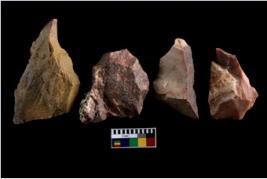 | Description / विवरण | There are n-4 of intact flake cores. Out of them 1 is made up Chalcedony and 3 are made up of Chert.There are multidirectional irregular dominant scar pattern on both dorsal and ventral face of the cores. |