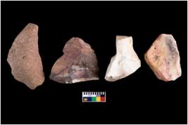 | Description / विवरण | There are n-4 of intact flake cores. Out of them 1 is made up Chalcedony and 3 are made up of Chert.There are multidirectional irregular dominant scar pattern on both dorsal and ventral face of the cores. |