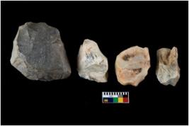 | Description / विवरण | There are n-4 of intact flake cores. Out of them 1 is made up Chalcedony and 3 are made up of Chert.There are multidirectional irregular dominant scar pattern on both dorsal and ventral face of the cores. |