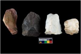 | Description / विवरण | There are n-4 of intact flake cores. Out of them 1 is made up Chalcedony and 3 are made up of Chert.There are multidirectional irregular dominant scar pattern on both dorsal and ventral face of the cores. |