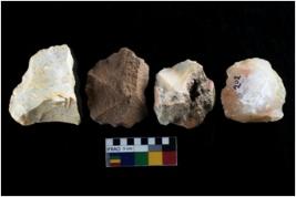 | Description / विवरण | There are n-4 of intact cores. Out of them 1 is made up Chalcedony and 3 are made up of Chert.There are multidirectional irregular dominant scar pattern on both dorsal and ventral face of the cores. |