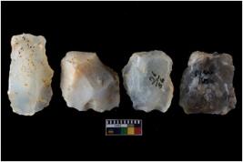 | Description / विवरण | There are n-4 of intact cores. Out of them 1 is made up Chalcedony and 3 are made up of Chert.There are multidirectional irregular dominant scar pattern on both dorsal and ventral face of the cores. |