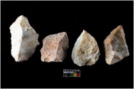 | Description / विवरण | There are n-4 of intact cores. Out of them 1 is made up Chalcedony and 3 are made up of Chert.There are multidirectional irregular dominant scar pattern on both dorsal and ventral face of the cores. |