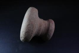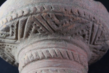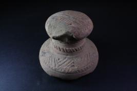 Circular debbar with topmost part consisting of small circle, some crisscross lines are als9o there in incised form, a thick cylindrical grip is there with circles incised on it, lower body is again forming spherical shape.
