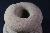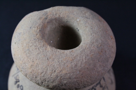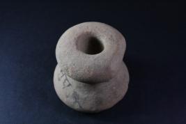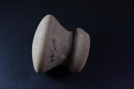 Circular debbar has a thick circular rim on top with a hole, lower body is wider consisting of a grip and bottom part is curved.