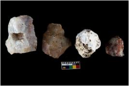 | Description / विवरण | There are n-4 of intact flake cores. Out of them 1 is made up Chalcedony and 3 are made up of Chert.There are multidirectional irregular dominant scar pattern on both dorsal and ventral face of the cores. |