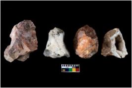 | Description / विवरण | There are n-4 of intact flake cores. Out of them 1 is made up Chalcedony and 3 are made up of Chert.There are multidirectional irregular dominant scar pattern on both dorsal and ventral face of the cores. |