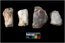 | Description / विवरण | There are n-4 of intact flake cores. Out of them 1 is made up Chalcedony and 3 are made up of Chert.There are multidirectional irregular dominant scar pattern on both dorsal and ventral face of the cores. |