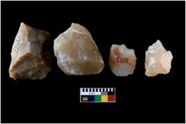 | Description / विवरण | There are n-4 of intact flake cores. Out of them 1 is made up Chalcedony and 3 are made up of Chert.There are multidirectional irregular dominant scar pattern on both dorsal and ventral face of the cores. |