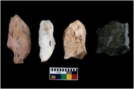 | Description / विवरण | There are n-4 of intact flake cores. Out of them 1 is made up Chalcedony and 3 are made up of Chert.There are multidirectional irregular dominant scar pattern on both dorsal and ventral face of the cores. |