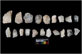 | Description / विवरण | Specimen of flake tools with prominent flaking marks. They are made up of a short flakes with sides trimmed. Some of them are rectangular flakes with wavy thick distal end and broken functional top. |
