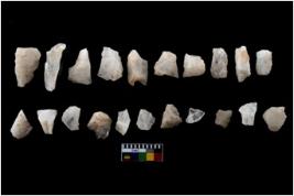 | Description / विवरण | Specimen of flake tools with prominent flaking marks. They are made up of a short flakes with sides trimmed. Some of them are rectangular flakes with wavy thick distal end and broken functional top. |