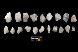 | Description / विवरण | Specimen of flake tools with prominent flaking marks. They are made up of a short flakes with sides trimmed. Some of them are rectangular flakes with wavy thick distal end and broken functional top. |