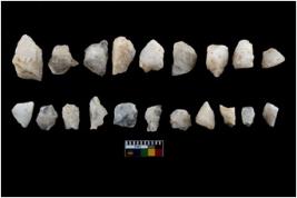 | Description / विवरण | Specimen of flake tools with prominent flaking marks. They are made up of a short flakes with sides trimmed. Some of them are rectangular flakes with wavy thick distal end and broken functional top. |