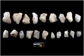 | Description / विवरण | Specimen of flake tools with prominent flaking marks. They are made up of a short flakes with sides trimmed. Some of them are rectangular flakes with wavy thick distal end and broken functional top. |