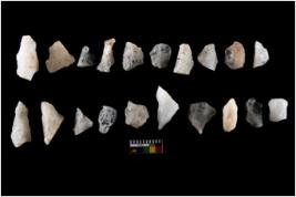 | Description / विवरण | Specimen of flake tools with prominent flaking marks. They are made up of a short flakes with sides trimmed. Some of them are rectangular flakes with wavy thick distal end and broken functional top. |