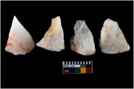 | Description / विवरण | There are n-4 of intact flake cores made up of Quartz. Some of them have bulge of percussion and some are flat flakes. |