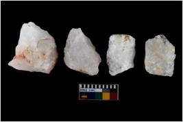 | Description / विवरण | There are n-4 of intact flake cores made up of Quartz. Some of them have bulge of percussion and some are flat flakes. |
