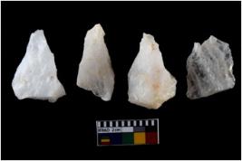 | Description / विवरण | There are n-4 of intact flake cores made up of Quartz. Some of them have bulge of percussion and some are flat flakes. |