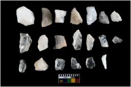 | Description / विवरण | Specimen of flake tools with prominent flaking marks. They are made up of a short flakes with sides trimmed. Some of them are rectangular flakes with wavy thick distal end and broken functional top. |