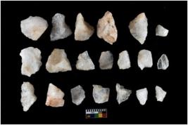 | Description / विवरण | Specimen of flake tools with prominent flaking marks. They are made up of a short flakes with sides trimmed. Some of them are rectangular flakes with wavy thick distal end and broken functional top. |