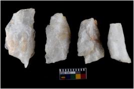 | Description / विवरण | There are n-4 of intact flake cores made up of Quartz. Some of them have bulge of percussion and some are flat flakes. |