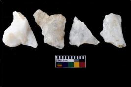 | Description / विवरण | There are n-4 of intact flake cores made up of Quartz. Some of them have bulge of percussion and some are flat flakes. |