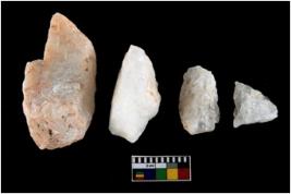 | Description / विवरण | There are n-4 cores; one is rosy quartz and rest are milky quartz. Few flakes have been removed from the sides. |