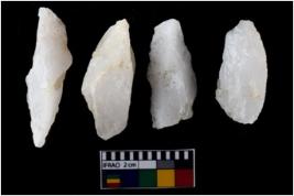 | Description / विवरण | There are n-4 of intact flake cores made up of Quartz. Some of them have bulge of percussion and some are flat flakes. |