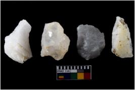| Description / विवरण | There are n-4 of intact flake cores made up of Quartz. Some of them have bulge of percussion and some are flat flakes. |