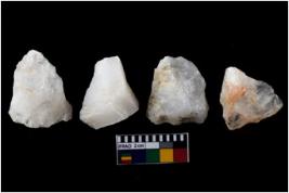| Description / विवरण | There are n-4 of intact flake cores made up of Quartz. Some of them have bulge of percussion and some are flat flakes. |