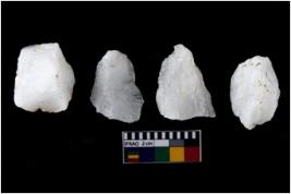 | Description / विवरण | There are n-4 of intact flake cores made up of Quartz. Some of them have bulge of percussion and some are flat flakes. |