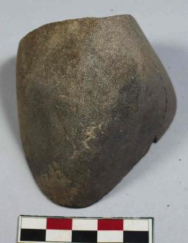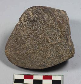 | Description / विवरण | Fragmented grinding tool having irregular shape with flat base. It has a prominent crack on one side with smooth surface. |