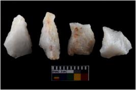 | Description / विवरण | There are n-4 of intact flake cores made up of Quartz. Some of them have bulge of percussion and some are flat flakes. |