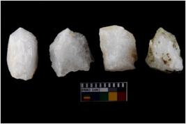 | Description / विवरण | There are n-4 of intact flake cores made up of Quartz. Some of them have bulge of percussion and some are flat flakes. |