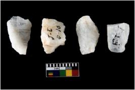 | Description / विवरण | Specimen of cores with weathered cortex and several broad fluted marks. Some of them are irregular in shape, whereas some are tapering at one end. |
