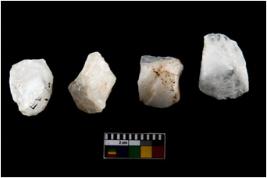 | Description / विवरण | Specimen of cores with weathered cortex and several broad fluted marks. Some of them are irregular in shape, whereas some are tapering at one end. |