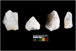 | Description / विवरण | Specimen of cores with weathered cortex and several broad fluted marks. Some of them are irregular in shape, whereas some are tapering at one end. |