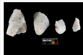 | Description / विवरण | Specimen of cores with weathered cortex and several broad fluted marks. Some of them are irregular in shape, whereas some are tapering at one end. |