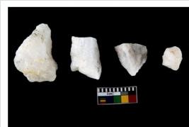 | Description / विवरण | Specimen of cores with weathered cortex and several broad fluted marks. Some of them are irregular in shape, whereas some are tapering at one end. |
