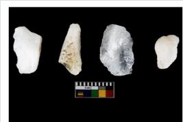 | Description / विवरण | Specimen of cores with weathered cortex and several broad fluted marks. Some of them are irregular in shape, whereas some are tapering at one end. |