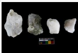 | Description / विवरण | Specimen of cores with weathered cortex and several broad fluted marks. Some of them are irregular in shape, whereas some are tapering at one end. |