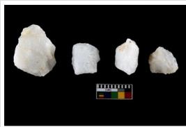 | Description / विवरण | Specimen of cores with weathered cortex and several broad fluted marks. Some of them are irregular in shape, whereas some are tapering at one end. |