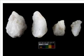 | Description / विवरण | Specimen of cores with weathered cortex and several broad fluted marks. Some of them are irregular in shape, whereas some are tapering at one end. |