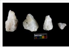 | Description / विवरण | Specimen of cores with weathered cortex and several broad fluted marks. Some of them are irregular in shape, whereas some are tapering at one end. |