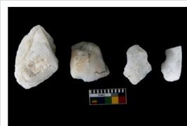 | Description / विवरण | Specimen of cores with weathered cortex and several broad fluted marks. Some of them are irregular in shape, whereas some are tapering at one end. |