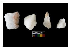 | Description / विवरण | Specimen of cores with weathered cortex and several broad fluted marks. Some of them are irregular in shape, whereas some are tapering at one end. |
