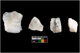 | Description / विवरण | Specimen of cores with weathered cortex and several broad fluted marks. Some of them are irregular in shape, whereas some are tapering at one end. |
